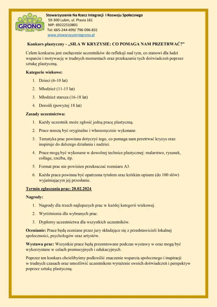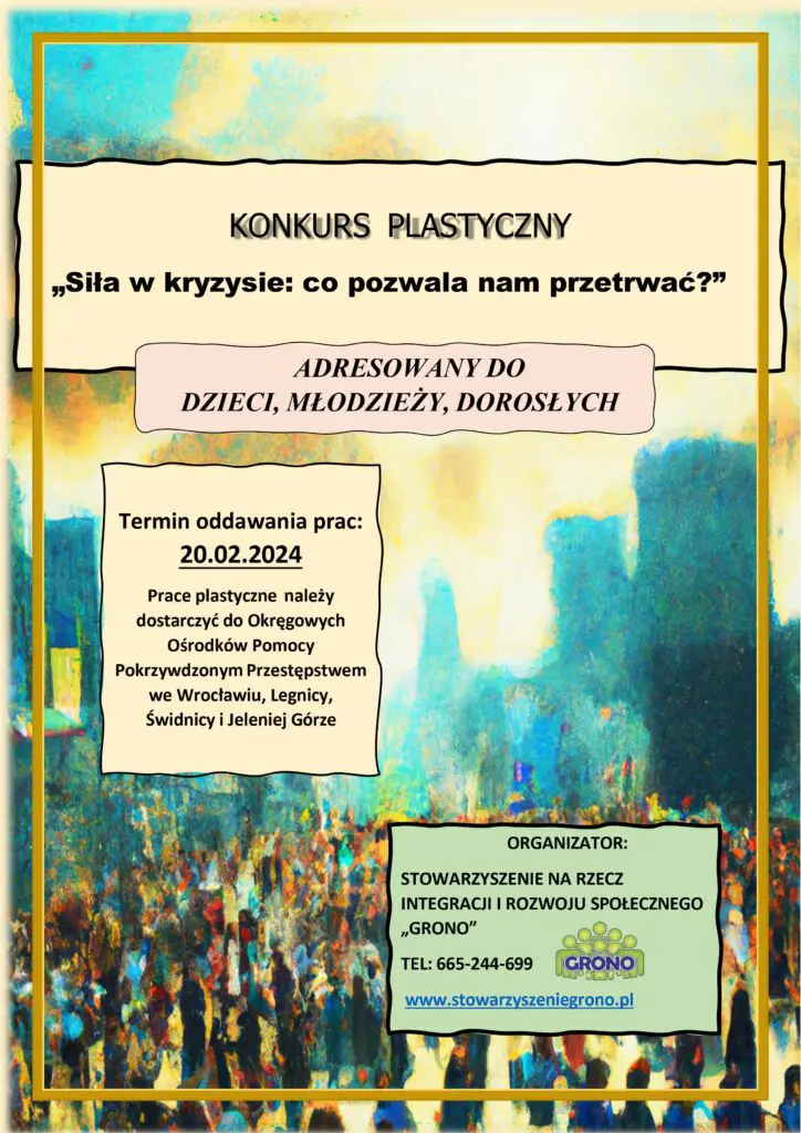 Konkurs – pod nazwą „Siła w kryzysie: co pomaga nam przetrwać” kierujemy do wszystkich, którzy potrafią i lubią posługiwać się ołówkiem, kredką, farbą, potrafią rzeźbić lub stworzyć collage – do dorosłych, młodzieży w wieku od 11 do 18 lat oraz do dzieci (od sześciu lat).