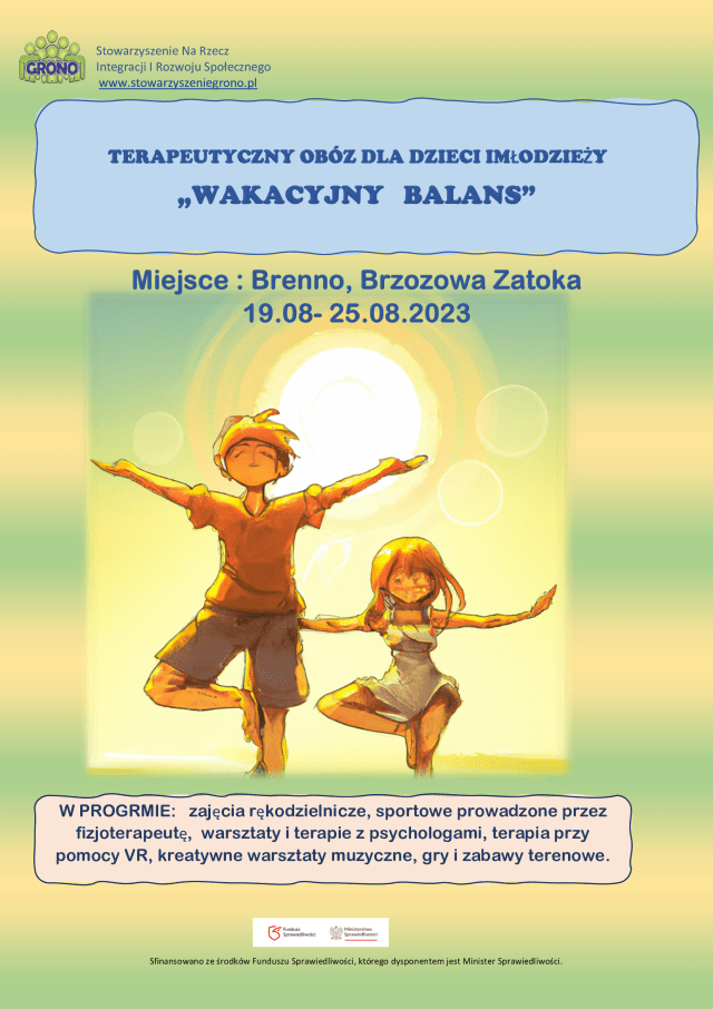 Stowarzyszenie “Grono” w ramach projektu “Lepsze Jutro” organizuje obóz terapeutyczny. Na “Wakacyjny Balans” pojedziemy nad jezioro do Brenna. Już nie możemy się doczekać!