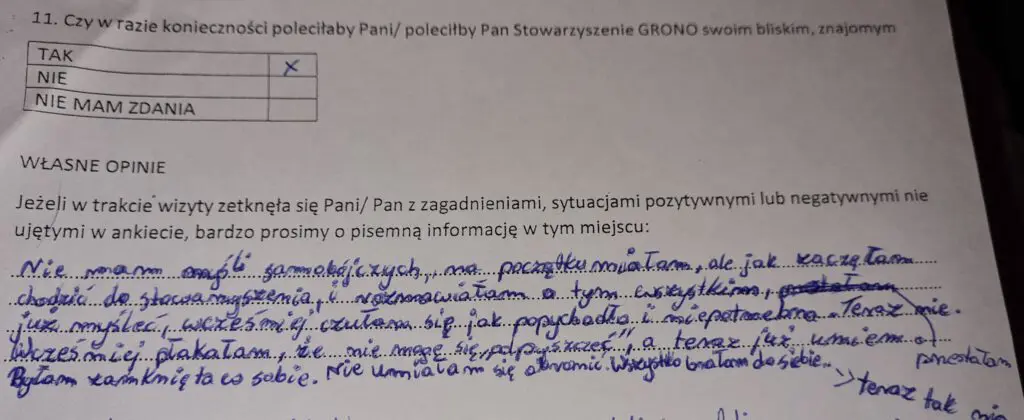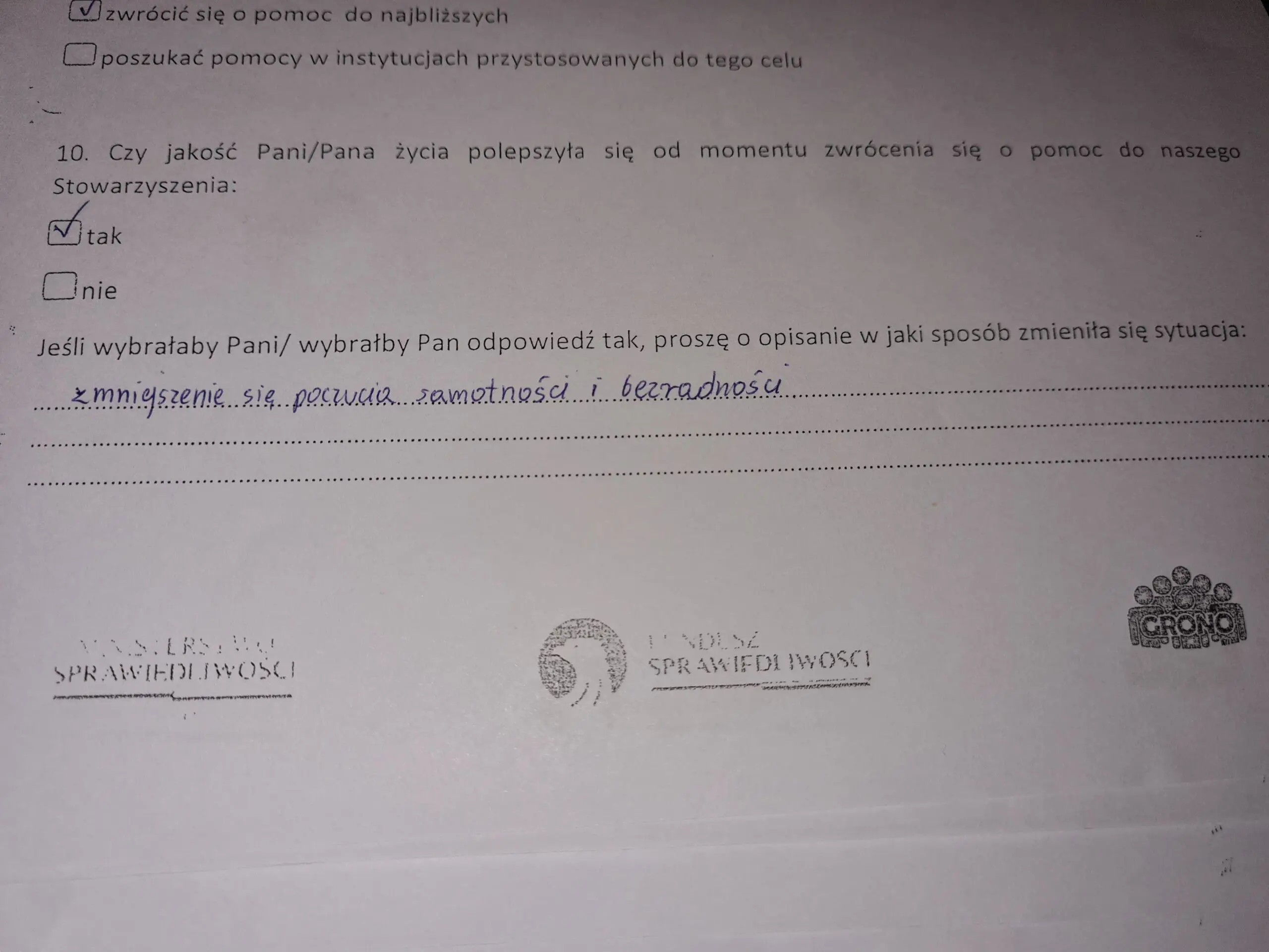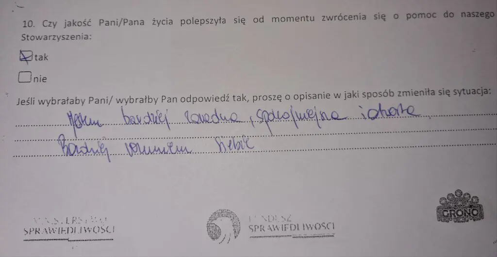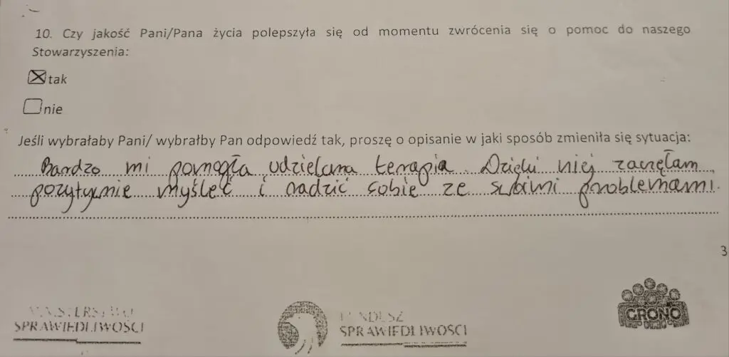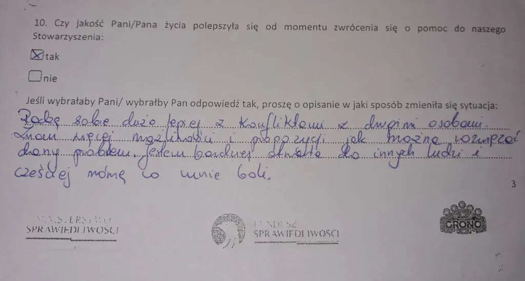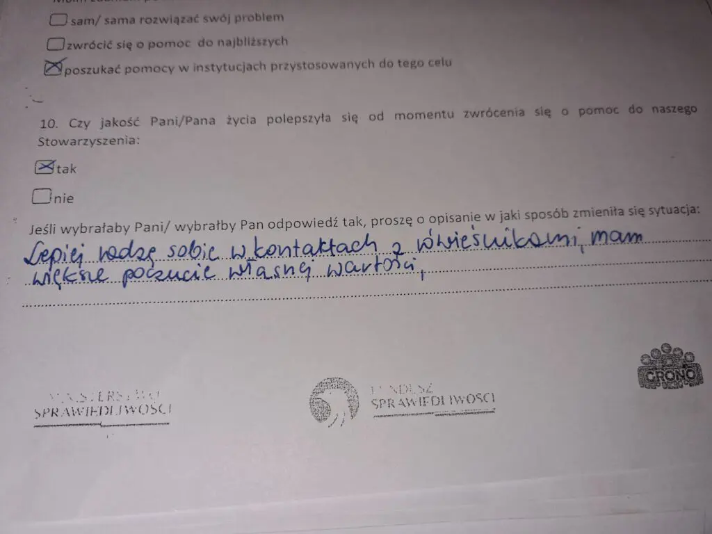 Z projektu, współfinansowanego przez Fundusz Sprawiedliwości, skorzystało – w różnej formie – łącznie blisko 1500 osób. Poniżej zamieszczamy kilka fragmentów ankiety, w której sami zainteresowani mogli wyrazić swoją opinię na temat projektu.