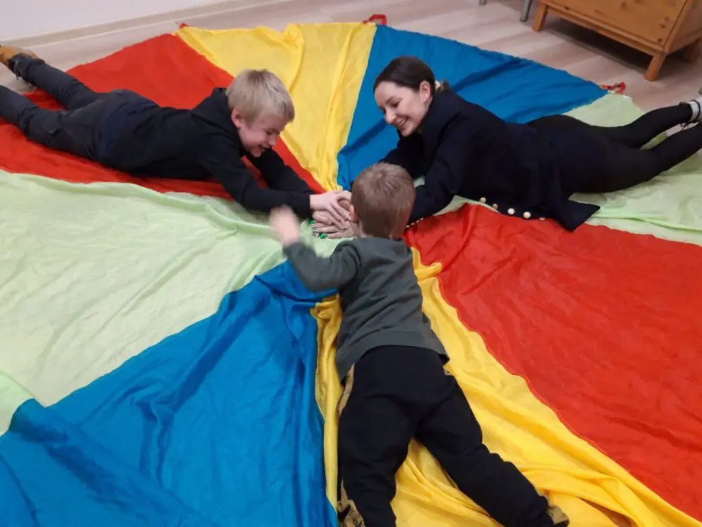 Można o swoich przeżyciach opowiedzieć za pomocą papierowego teatrzyku kamishibai, rodem z Japonii, a można też po prostu ćwiczyć zmysły i koncentrację łapiąc brzegi chusty animacyjnej, która jako żywo przypomina spadochron. Wyobraźnia pracuje pełną parą, a uczestnicy, przy okazji, dowiadują się, czym są zmysły dotyku i lepiej poznają siebie nawzajem.