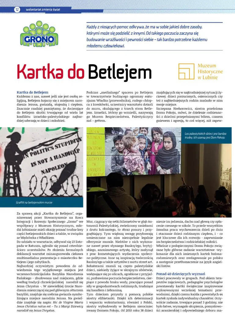 Stowarzyszenie Grono otwiera klub wolontariusza z elementami socjoterapii dla dzieci i młodzieży z Lubina i okolic. „Biuro do Spraw Dobrych”, bo taką nazwę będzie nosił klub rozpocznie swoją działalność warsztatami „Kartka Do Betlejem”, w czasie których uczestnicy będą mogli wykonać zadanie konkursowe oraz podpisać umowę wolontariacką.