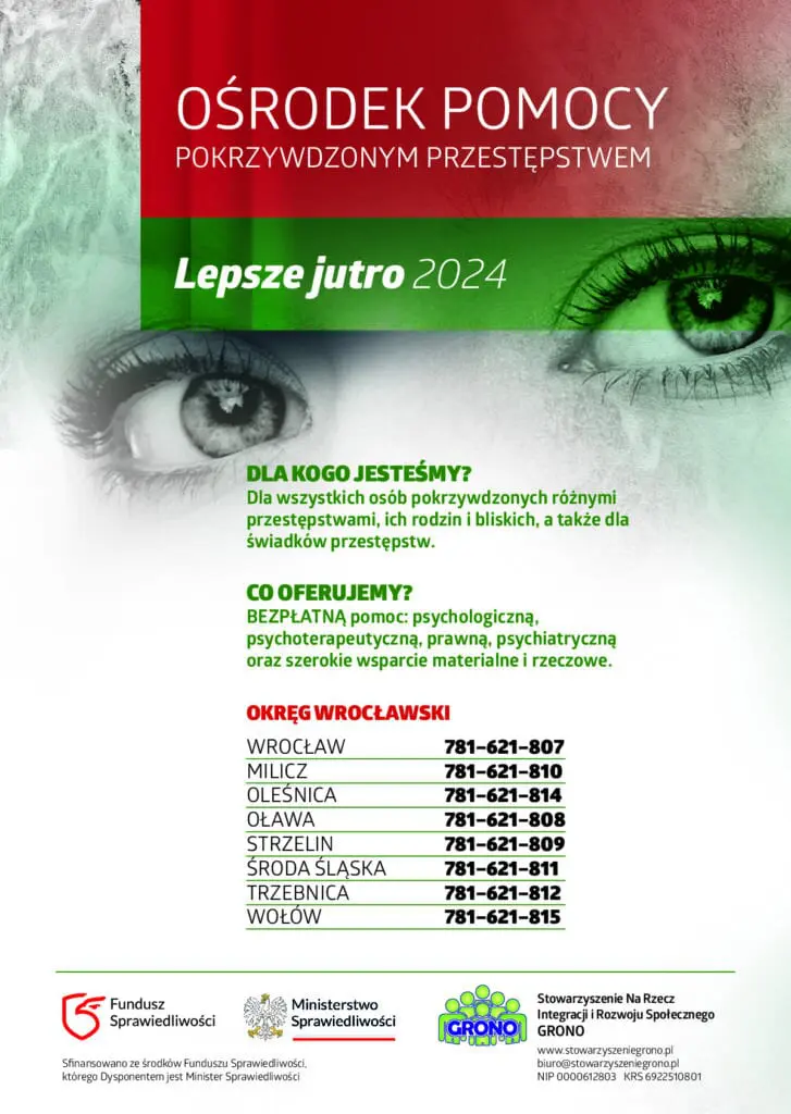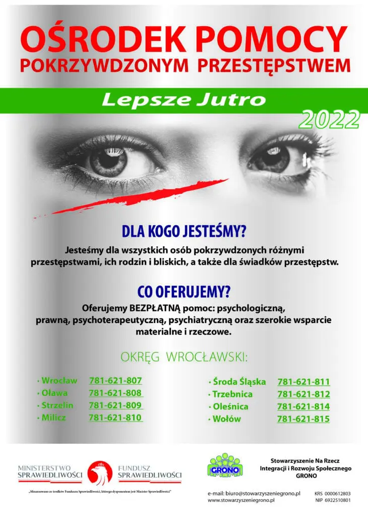 W ramach projektu – w latach 2022-2025 – Stowarzyszenie “Grono” uruchomiło i będzie prowadzić w okręgu wrocławskim osiem ośrodków pomocy pokrzywdzonym przestępstwem (Okręgowy Ośrodek we Wrocławiu oraz Lokalne Punkty w Oławie, Strzelinie, Miliczu, Środzie Śląskiej, Trzebnicy, Oleśnicy i Wołowie).