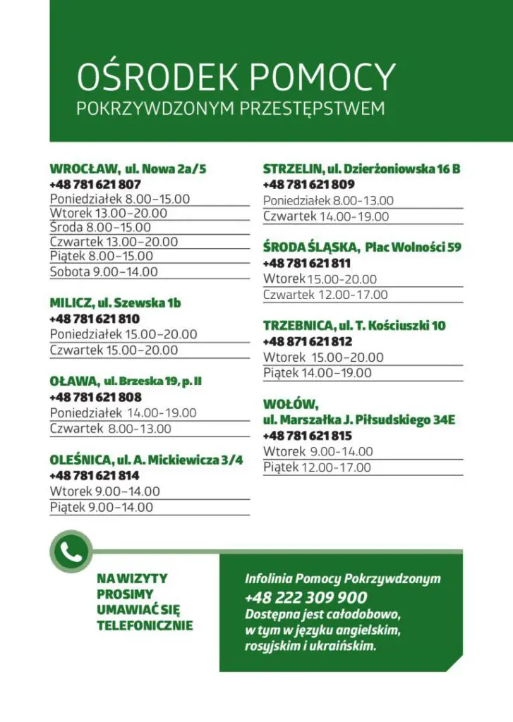 Linia Pomocy Pokrzywdzonym: +48 222 309 900. Infolinia jest dostępna całodobowo, w tym w języku angielskim, rosyjskim i ukraińskim.